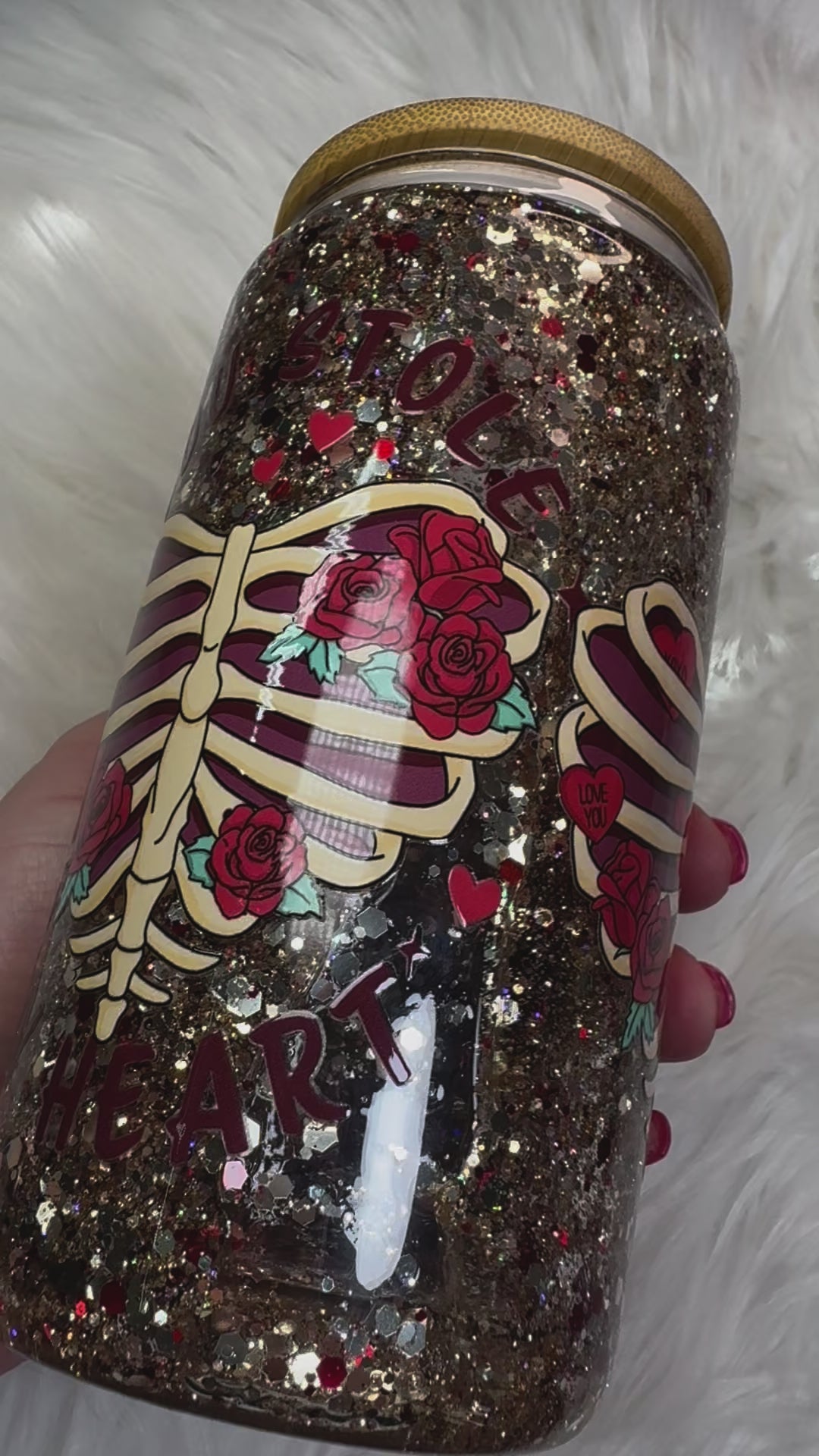This is a 16 ounce glass snow globe tumbler. This tumbler is filled with liquid and glitter to create a snow globe effect! There is a UV decal on this tumbler. This tumbler is not dishwasher safe. Hand wash all tumblers. This tumbler comes with a bamboo lid and plastic straw.